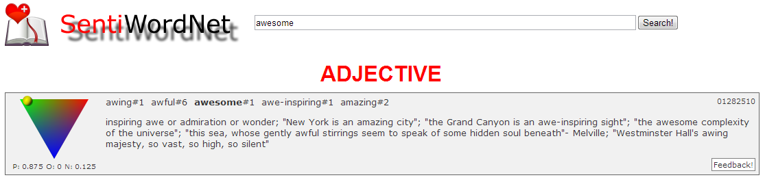 Using this class we can query a word when used as a specific part of speech (adjective, verb, noun and adverb) using getadjecvive(), getverb() and so on. These methods return a tuple of numeric values (positive, negative) indicating word polarity known to the lexicon. Another simplification implemented here applies when words carry multiple senses: the opinion of each of those is averaged out to obtain the output tuple - ie. other than separating words by part of speech, no word sense disambiguation takes place.