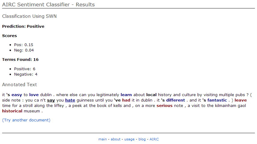The output of this script is a tuple (positive, negative) containing the overall positive and negative sentiment for the document (in the above example, we classify the document as positive). It also generates an annotated version of the input document with part of speech tags and additional tags indicating sentiment scores for each word.